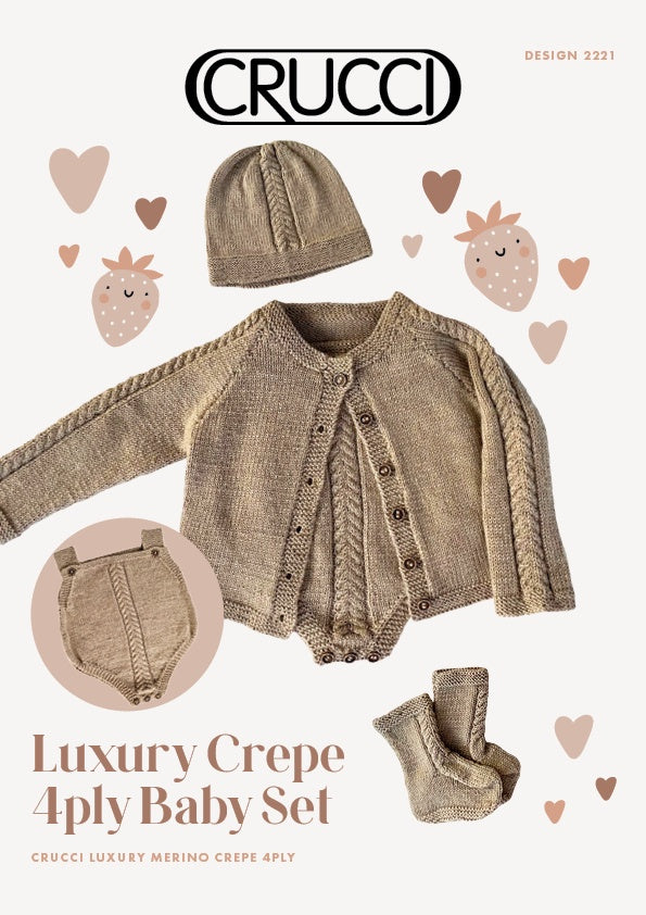 Pattern design 2221 is for a luxury crepe 4ply baby set. This pattern uses 4ply Crucci Crepe. Intermediate skill level. Comes in sizes 0 -12 months.