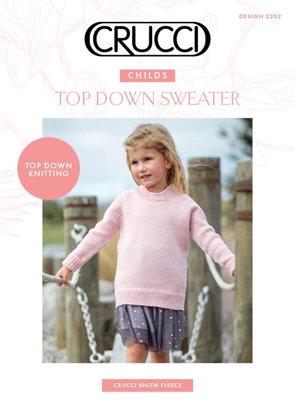 Knitting pattern for a Child's Top Down Sweater. Uses Crucci 8 Ply wool.  Intermediate skill level required. Comes in kids sizes 2-10.