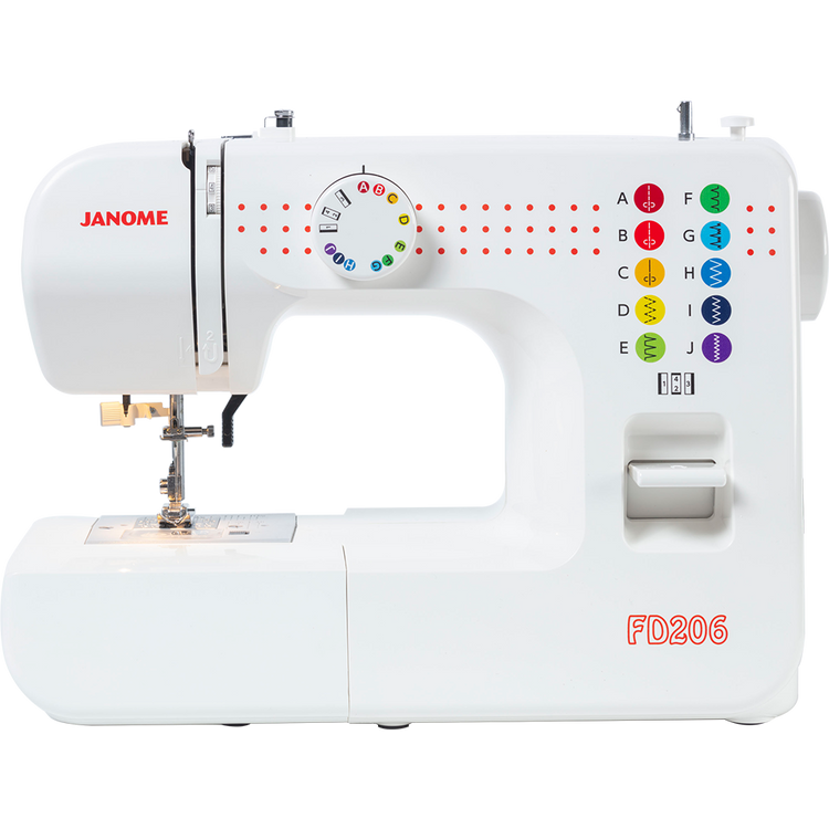 Janome FD206 is a modern starter sewing machine with 10 pre-set everyday stitches including a buttonhole. The FD series are among the classic utility sewing machines and are ideal for newcomers and novice sewists.