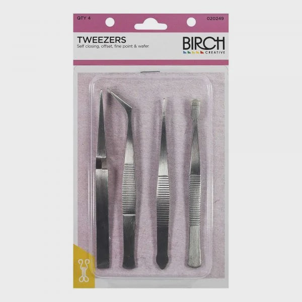 Tweezer Set x 4 pieces. Includes self closing, offset, straight and wafer. Ideal to use with placing of small and delicate papers for paper tole, decoupage, scrapbooking, machine threading and other fine art and craft projects.
