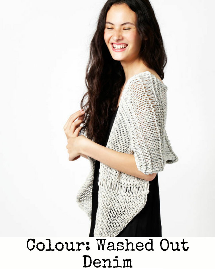 This kit is knitted with Billie Jean Yarn, our up-cycled yarn made of pre-consumer denim waste.